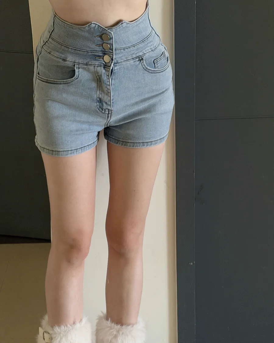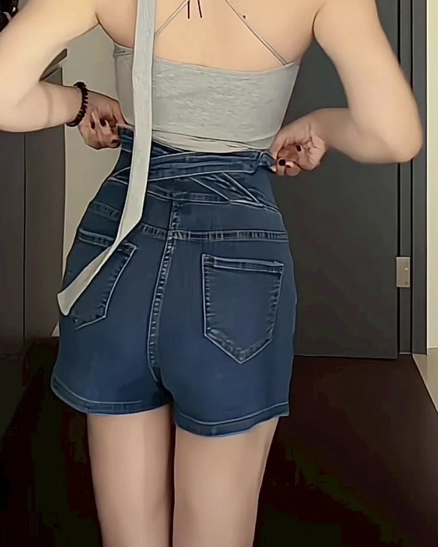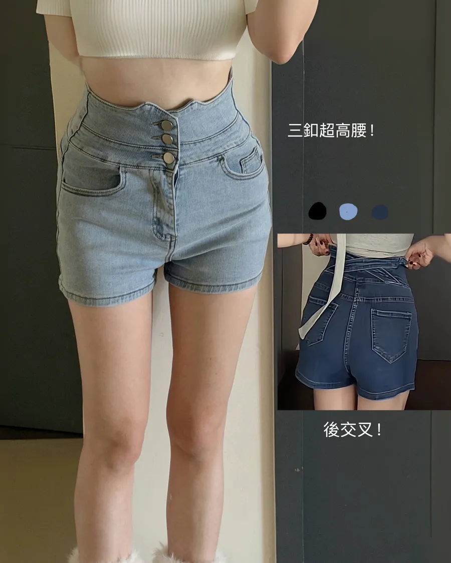 必帶款!!三釦高腰修身後交叉牛仔短褲
