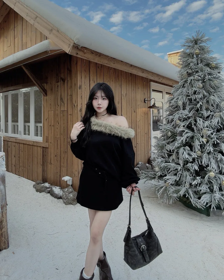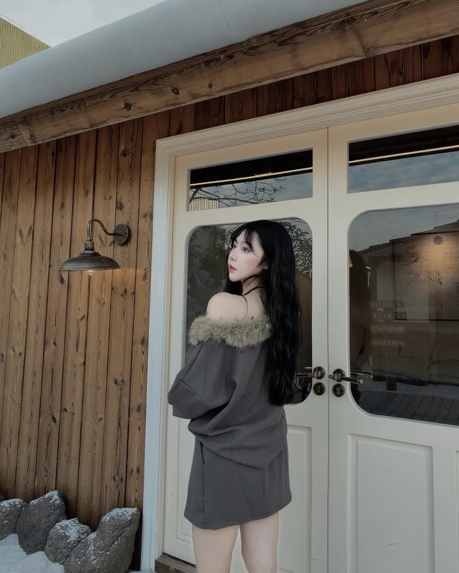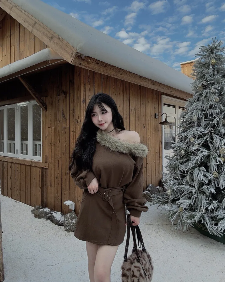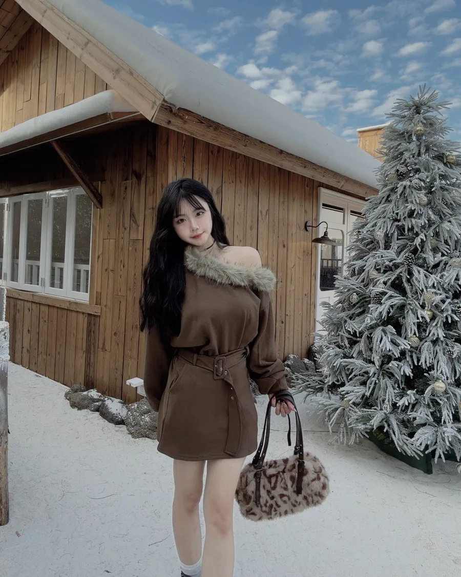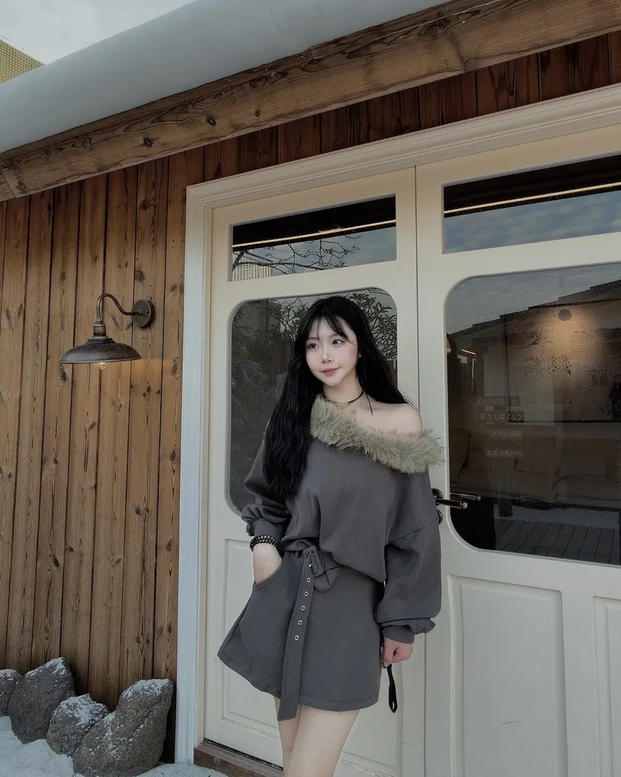 高級感毛領斜肩短裙套裝(附腰帶 大尺碼可穿)