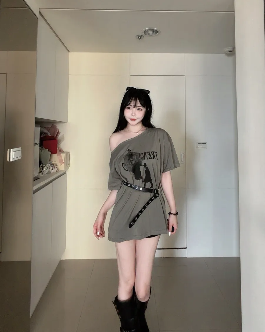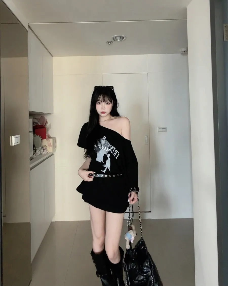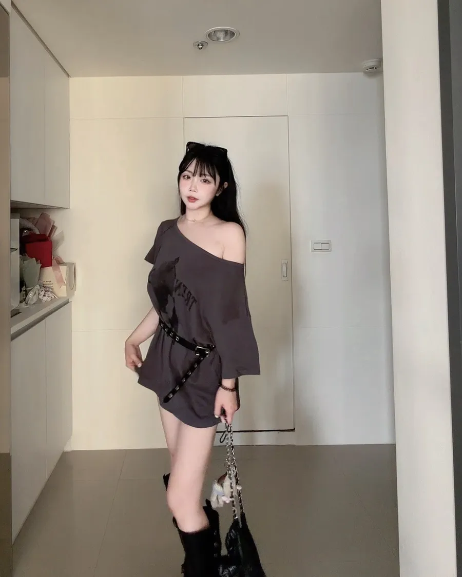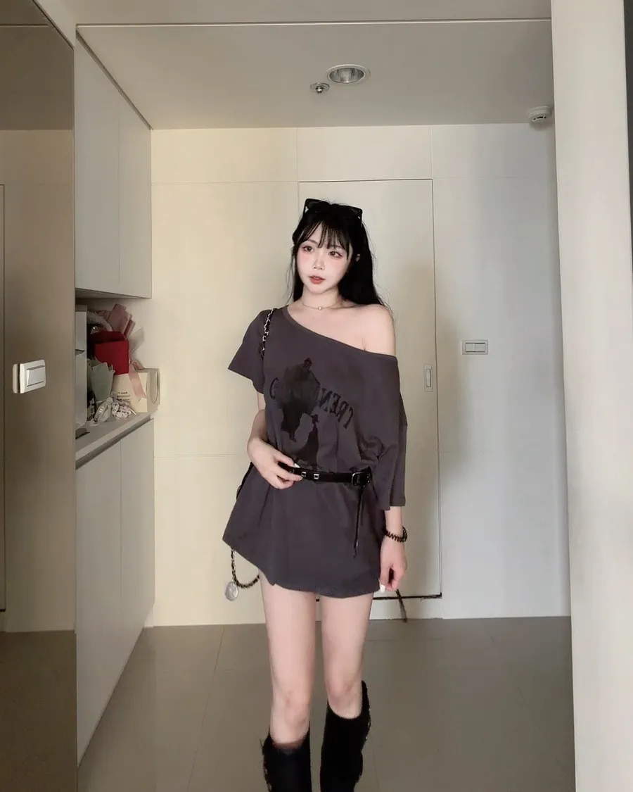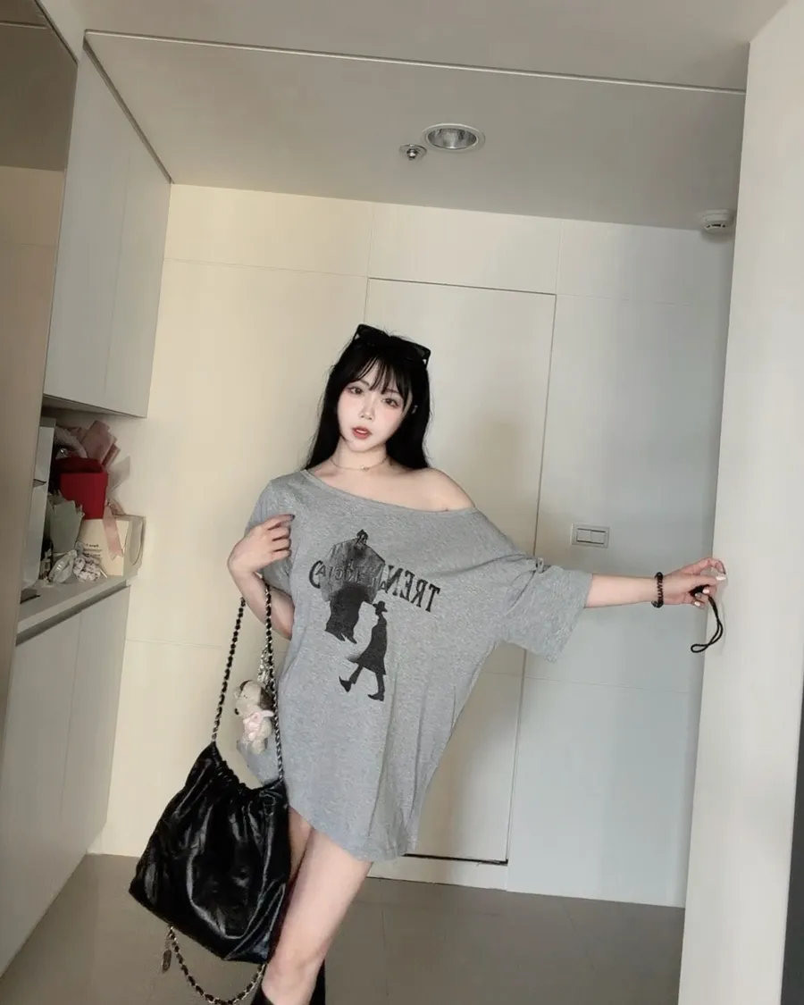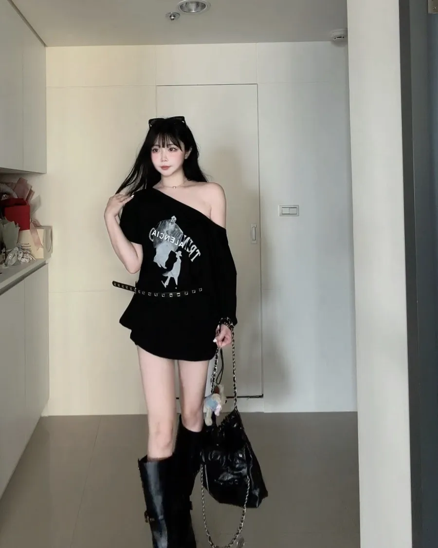 闆娘自留🖤個性斜肩印花上衣(附腰帶)