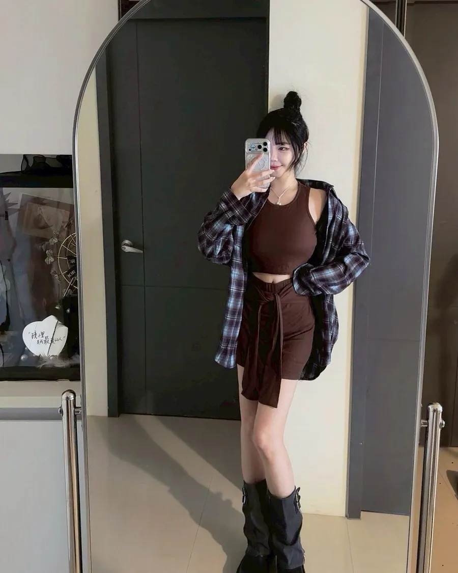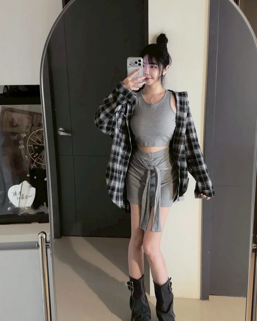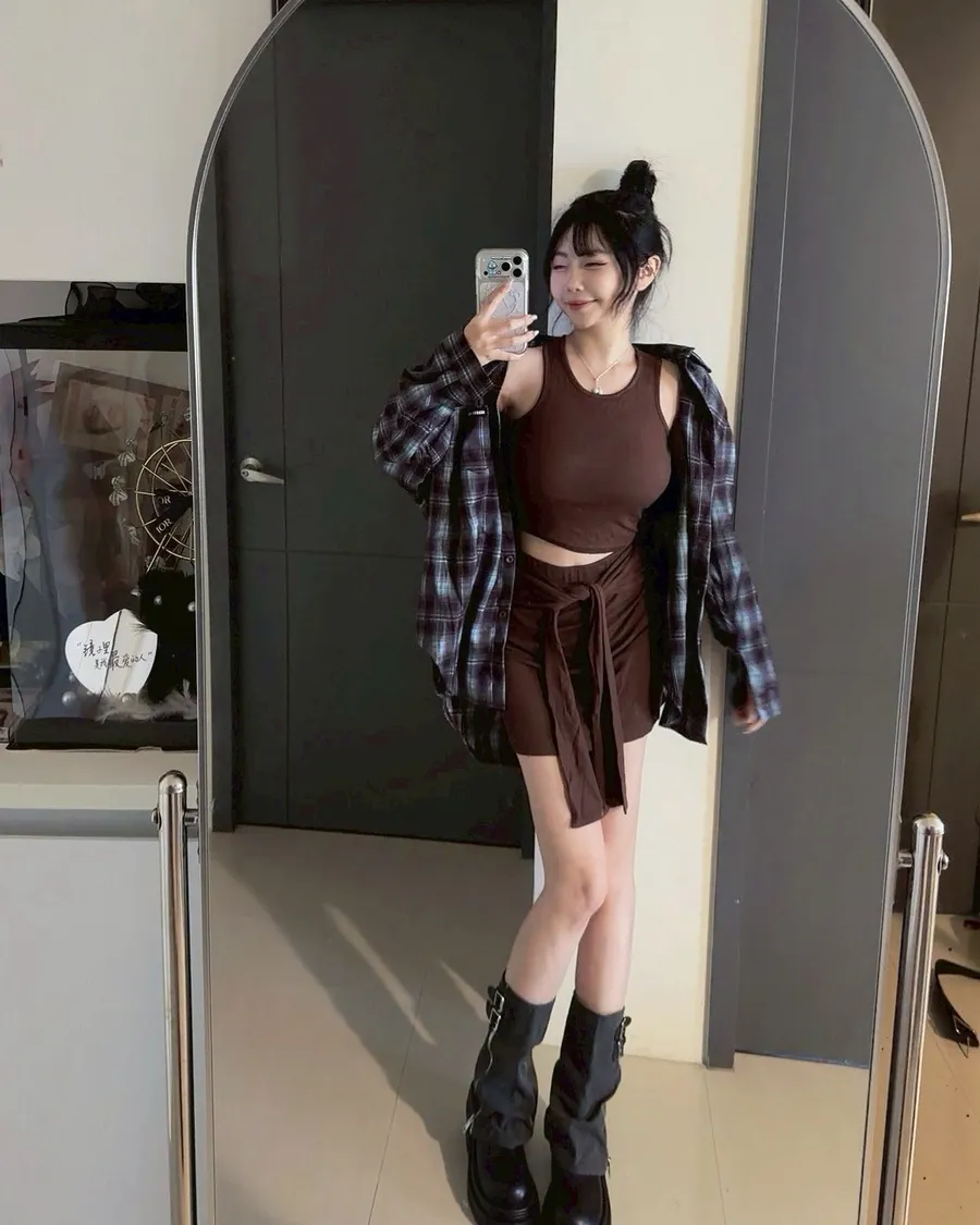 格紋襯衫+背心+綁帶短裙3件套set