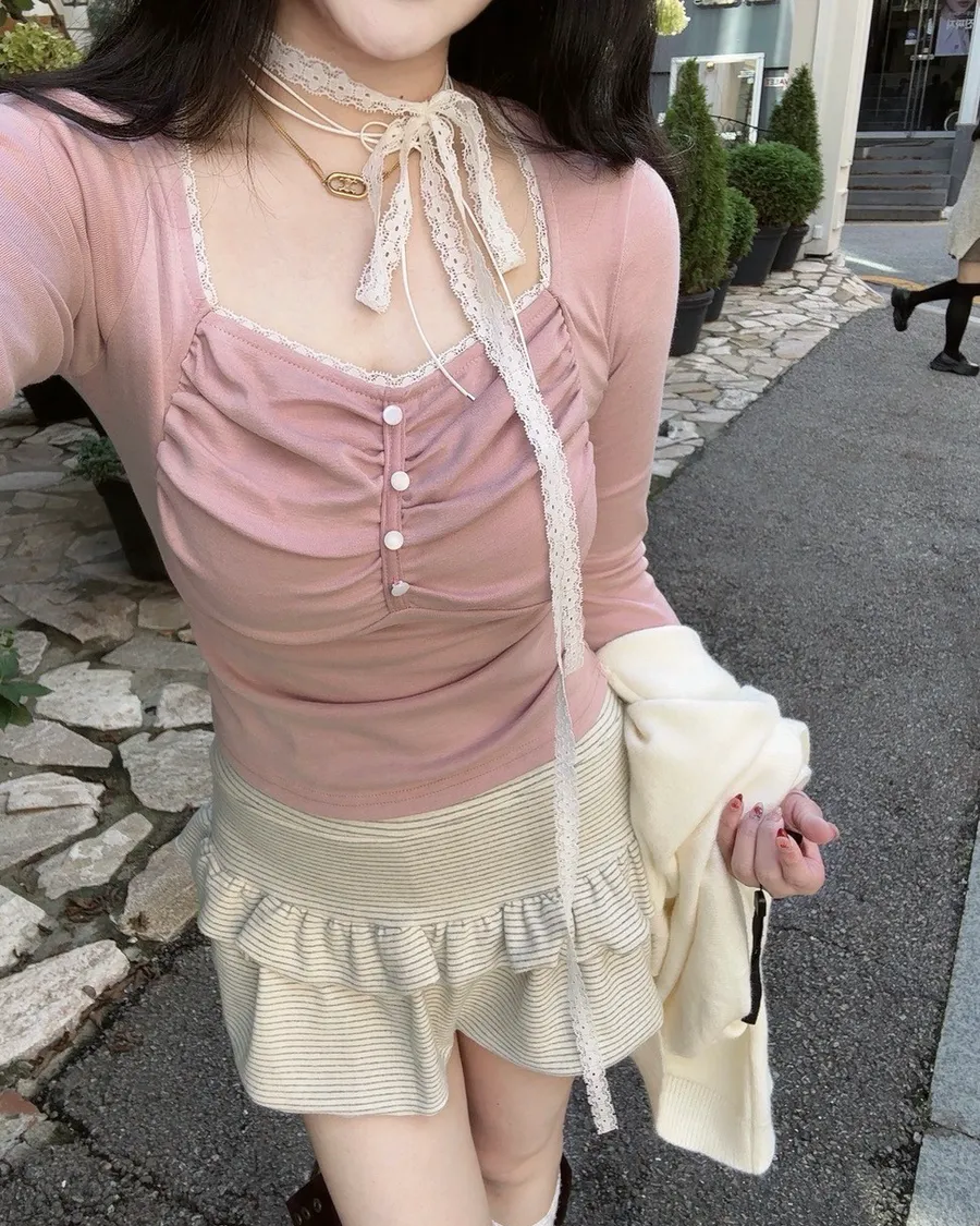 🇰🇷🌟純慾蕾絲滾邊修身上衣(附蕾絲繞脖)